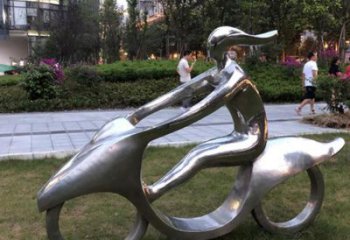 不銹鋼雕塑——抽象人物騎車裝點公園草地