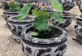經典荷花石雕浮雕圓形水缸,裝點您的庭院