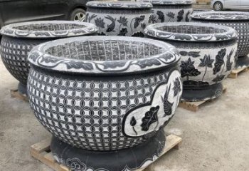 仿古青石水缸魚缸安放荷花刻飾鯉魚