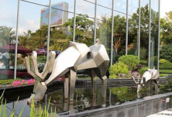 精致雕塑,幾何鏡面不銹鋼鹿,點綴精致水景小品